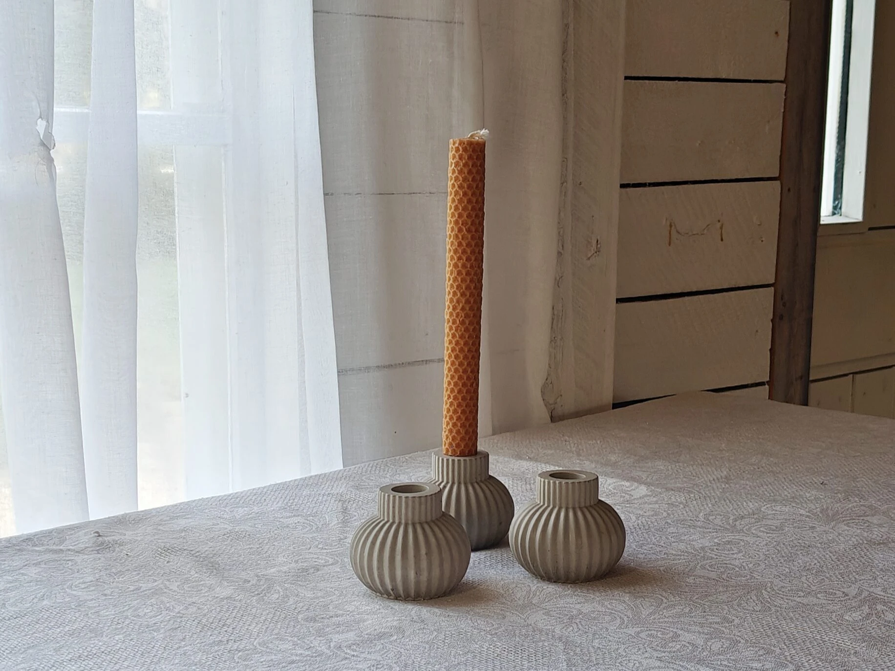 Veistoksellinen ja minimalistinen kynttilänjalka, jossa betonin rouheus kohtaa pehmeän, pyöreän muodon. Pallomainen design tekee tästä kynttilänjalasta näyttävän yksityiskohdan, joka sopii niin moderniin kuin boheemiin sisustukseen. Pinnan pienet sävyerot ja kuviot tekevät jokaisesta kynttiläjalasta yksilöllisen.